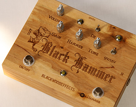 Die Bilder und die Texte dieser Website sind von mir und nur mit meiner ausdrücklichen Genehmigung anderweitig, wie z.B. bei Ebay, zu verwenden. Ein Pedal mit einem Holzgehäuse! Sowas hatte ich bisher noch nicht zum Test unter dem Fuß und zwischen Gitarre und Amp. Der schwarze Hammer wird in Handarbeit in Lindern in Deutschland hergestellt und zumindest in Sachen Optik ist aufgrund des ungewöhnlichen Materials jedes Pedal ein Unikat. Das Gehäuse des Testpedals besteht aus 0,6 mm starkem Sperrholz und auch die Bodenplatte ist aus diesem Material. Außerdem wurde das Pedal auch noch in einem Holzkasten als Verpackung geliefert. Die Holzoberfläche erscheint mir unbehandelt, vielleicht leicht geölt. Die Beschriftung ist heiß eingestanzt, so kann man das wohl beschreiben. Ein Fachausdruck dafür fällt mir gerade nicht ein. Blackwoodeffekts bietet an, dass man sich das Holz selbst aussuchen kann. Man kann sich also z.B. ein schön gemasertes Stück aussuchen und in Sachen Oberflächenbehandlung kann man sicher auch mit dem Hersteller reden. Die Kontaktdaten sind: