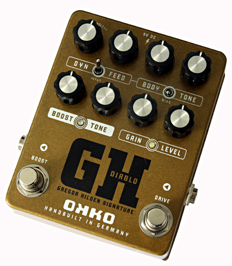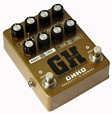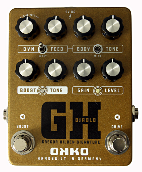 Ein neuer güldener Diablo ist in der bunten Zerrerwelt gelandet. Der Namenszusatz GH steht hier für Gregor Hilden, das Gerät ist ein Signature-Pedal. Gregor Hilden macht klasse Musik und hat einige schöne CDs herausgebracht. Aber er verkauft auch Gitarren und wohl so ziemlich jeder Gitarrist, der auch mal bei youtube reinschaut kennt auch die vielen Videos, in denen er zum Verkauf stehende Vintage Gitarren vorstellt. Dort benutzt er sehr oft einen Okko Diablo. Für mich ist er ein Paradebeispiel dafür, wie viel in Sachen Ton vom Spieler abhängt. Ich hab auch gerne und oft einen Diablo gespielt, klang und klinge damit aber immer ganz anders. Vor allem viel aggressiver im Ton. Weil mich das wunderte, habe ich Gregor Hilden auch mal angemailt mit der Frage, wie er denn den Diablo so einstellt. Aber auch mit seinen Einstellungsvorschlägen klang ich überhaupt nicht wie er. Also das mit dem "Ton aus den Fingern"... da ist definitiv was dran! :-)