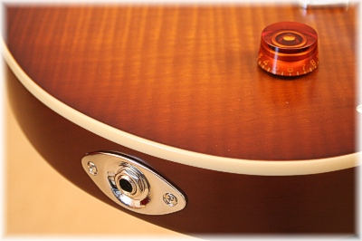Oben auf den beiden Fotos sieht man die Shapings des Korpus. Da passt ein nicht allzu ausgeprägter Bauchansatz gut rein und der rechte Unterarm wird nicht von einer scharfen Kante malträtiert. Sehr bequem hängt die Gitarre am Gurt. Einen kleinen Tick leichter als meine Fender Strat ist sie. Den Fünfwegschalter für die Pickups erreicht man gut mit dem kleinen Finger, das Volumepoti ebenso. Das Tonpoti etwas schlechter, da ist der Vibratohebel natürlich etwas im Weg. Aber erstens braucht man das ja nicht ganz so oft und außerdem kann man nicht alles haben. Die Potis arbeiten gut. Beim Runterdrehen des Volume gehen kaum bis gar keine Höhen verloren, damit kan man gut hantieren.