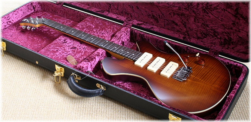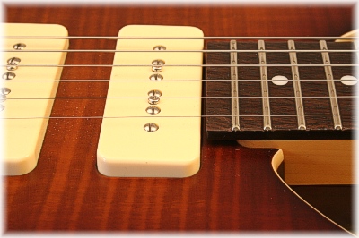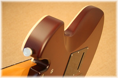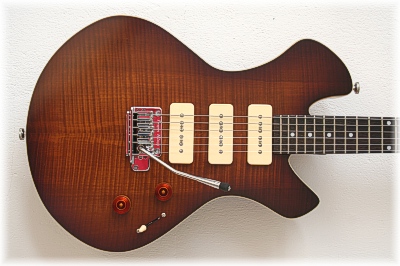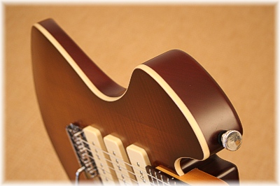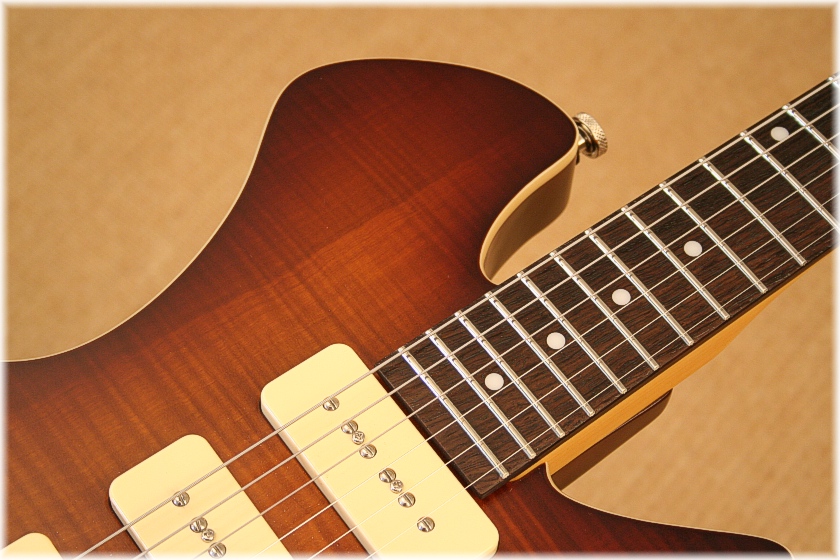 Der eigenständig geformte Korpus der TKs ist aus Erle, der Hals aus Ahorn mit nicht gerade dünnem Palisandergriffbrett und auf Höhe des dritten Bundes angeschäfteter Kopfplatte. Der Sattel ist aus Graphit. Die Testgitarre hat zwar noch keine, aber die Serienausführung wird mit Locking Tunern ausgestattet sein. Oben hat der Korpus ein hübsches Ahornfurnier mit vielen Stripes verpasst bekommen. An den Zargen und auf dem Rücken ist er in einem transparent rotbraun ebenfalls seidenmatt lackiert und auch der verschraubte Ahornhals hat seidenmatte Farbe abbekommen. Allerdings farblos, was keinesfalls negativ gemeint ist. Die untere, vordere Ecke des Korpus am Halsübergang ist etwas abgeflacht, was das Spiel in den höheren Lagen bequemer macht. Bequem sind auch die Strat-mäßigen Shapings an der oberen Korpusrückseite und vorne auf der Vorderseite auf Höhe der Armauflage. Ergonomisch günstig ist die ganze Sache. Die Decke ist rundherum mit einem farblich zu den P90 Kappen passenden einlagigen Binding versehen.