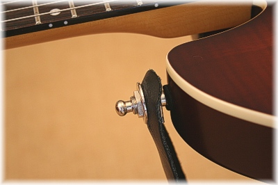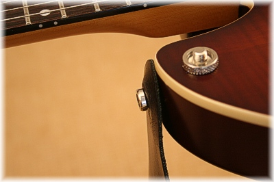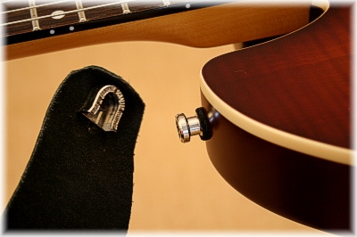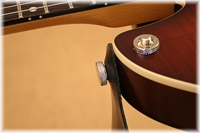 Unten sieht man noch ein paar Bilder von den Gurtknöpfen. Die kann man mit den Security Locks von Schaller benutzen. Man kann aber auch die große Rändelschraube, die man in den unteren beiden Fotos sieht nutzen und damit "normale" Gurte sichern. Eine feine Sache, die nicht unerwähnt bleiben soll.