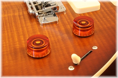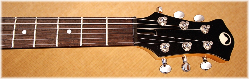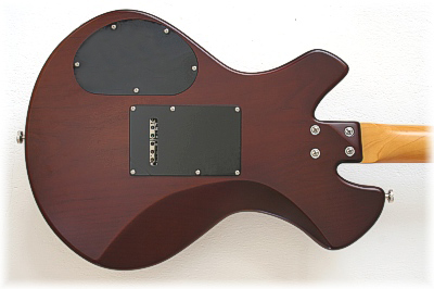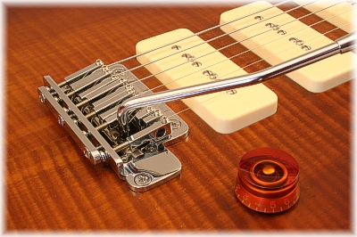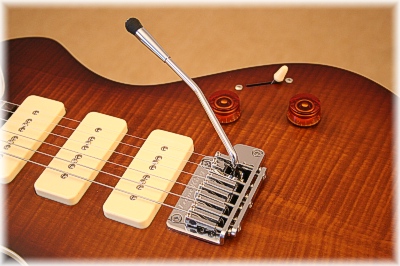 Das Vibrato ist ein King Trem. Mit etwas googlen findet man die Homepage des Herstellers. Großer Vorteil: man kann den Handballen auflegen, ohne dass das Vibrato reagiert. Der Hebel ist steckbar, was ich auch sehr praktisch finde. Die Buchse scheint aus irgendeinem Hartkunststoff zu sein, der Hebel saugt sich fast rein und nichts schlackert. Lässt man den Hebel los, dreht er nach unten weg. Die Saiten werden wie bei einem Strat Tremolo von hinten eingefädelt. Das King Trem Vibrato hat so etwas wie eine leichte "Mittenrast". In der Ruheposition ist es also sozusagen leicht geblockt. Man muss dadurch einen leichten Anfangswiderstand überwinden, egal in welche Richtung man das Trem (oder Vibrato, wie es ja eigentlich richtig heißt) bewegt. Daran muss man sich erstmal gewöhnen, insbesondere wenn man nur ganz leicht um den Ton herumvibrieren will, aber nach einer Weile gehts. Extreme Dive Bombs bis zum totalen Saitenschlaff sind nicht möglich, aber man kann ziemlich weit runter. Je dicker die Saite, desto weiter geht es abwärts. Hinauf ist es ähnlich. Die tiefe E Saite kann man ungefähr vier Halbtöne hochziehen, bei den dünneren Saiten wird es weniger. Die Stimmstabilität war bei der Testgitarre völlig in Ordnung, etwas besser als bei meiner Fender Strat. Mit den Locking Tuner des Serienmodells dürfte das dann wohl sogar noch etwas besser sein. Das Vibrato arbeitet mit zwei Federn. Diese sind mit Schaumstoffstreifen gefüllt. Damit kann man dieses Klingeln oder diesen Hall-ähnlichen Effekt unterdrücken, der manchmal durch das Mitschwingen der Federn bei solchen Vibratosystemen entsteht. Ein kleiner Trick, den man sich merken sollte.