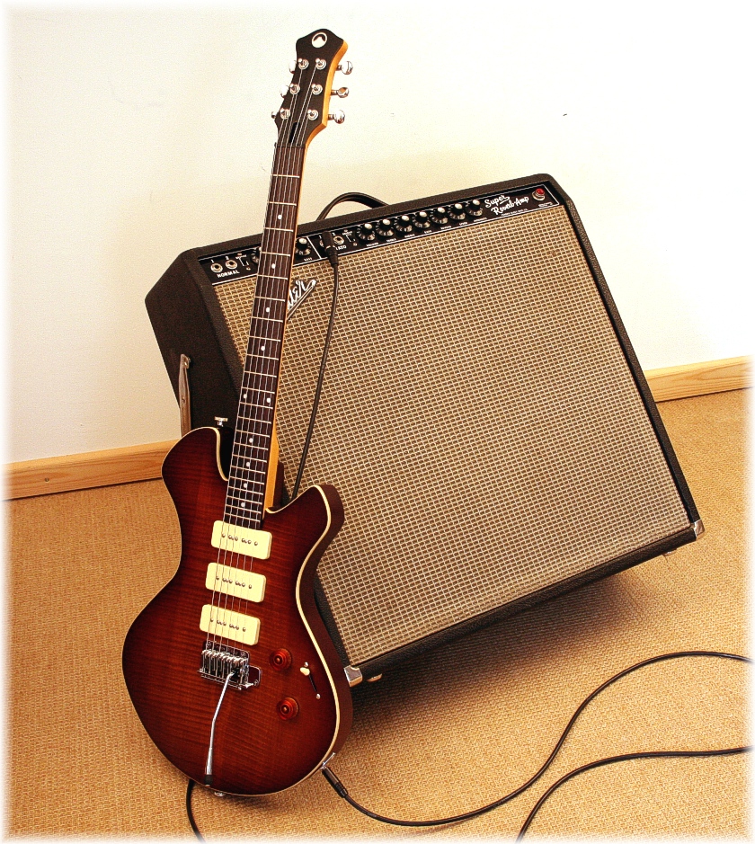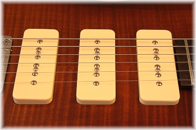 Die Pickups sind ganz schöne Kraftpakete. Da kommt Wumms raus. Wie zu erwarten ist, liegen die Klangresultate irgendwo zwischen Humbucker und Singlecoil. Das Dreierpack ist so verschaltet, dass es in den Zwischenstellungen nicht brummt. Sehr sinnvoll ist das, den die P90 sind bekannt für ihr Brummpotenzial. Aber sie sind auch bekannt auch für ihren rotzigen und dynamischen Klang und genau der kommt auch hier zu Tage. Fast mit Humbuckeroutput, aber mit mehr Spritzigkeit und Rotz als die eleganteren Doppelspuler gehen die drei richtig gut los. Das sind Rocker. High Gain ist konstruktionsbedingt nicht das beste Arbeitsfeld für P90, aber alle Zerrgrade darunter gehen ab wie Luzi. Alle fünf Schaltpositionen geben da eine sehr gute Figur ab und alle fünf geben sich auch Lautstärkemäßig ausgeglichen, obwohl alle drei Pickups gleich hoch eingestellt sind. Erlekorpus plus drei Pickups, das kann man durchaus an Stratocaster denken. Von der steckt auch viel drin im Klang. Die P90 Taranaki ist einer Stratocaster deutlich näher als einer Paula. Der Stegtonabnehmer hat noch am wenigsten Strat-Effekt parat. Der klingt recht eigenständig. Das ist ein ziemlich kompaktes dynamisches Rockbrett in ZZ Top Manier. Solche "Bärte-Licks" perlen da nur so raus. Mit meinem kleinen Peavey Classic 20 ging das so richtig schön ab, wie dafür gemacht. Ein bisschen Drehen am Volume Knopf und es wird clean. Eine richtige Arbeitsgitarre, die Spaß macht. In der ersten Zwischenposition wird es schon strattelig, aber natürlich mit enorm viel mehr Power. Strat on Dope sozusagen. Noch weiter in Richtung Hals wird der Strat-Anteil dann immer größer. Dreht man das Volume etwas zu klingt es in der zweiten Zwischenposition oder mit dem Halspickup schon fast SRV mäßig, so nach Texas Power Strat. Dreht man das Volume Poti ganz auf, gibts wieder den Strat-Overkill. Alles rau mit viel Schmatz und Rotz. Das Brummproblem hält sich dabei einigermaßen zurück. In den Zwischenpositionen ist ja sowieso Stille angesagt, aber auch sonst bleibt alles in einem akzeptablen Rahmen.